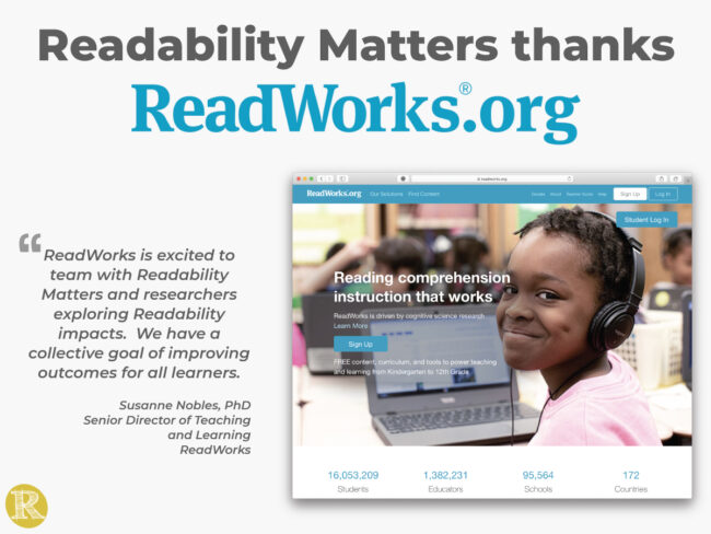 ReadWorks’ High-Quality Content in Readability Research Readability Matters is excited to announce that we have teamed up with the nonprofit ReadWorks to enhance testing materials used in research with K-12 students. ReadWorks uses cognitive science research to create world-class content. They currently serve over 16 million students and are growing rapidly as learning becomes…